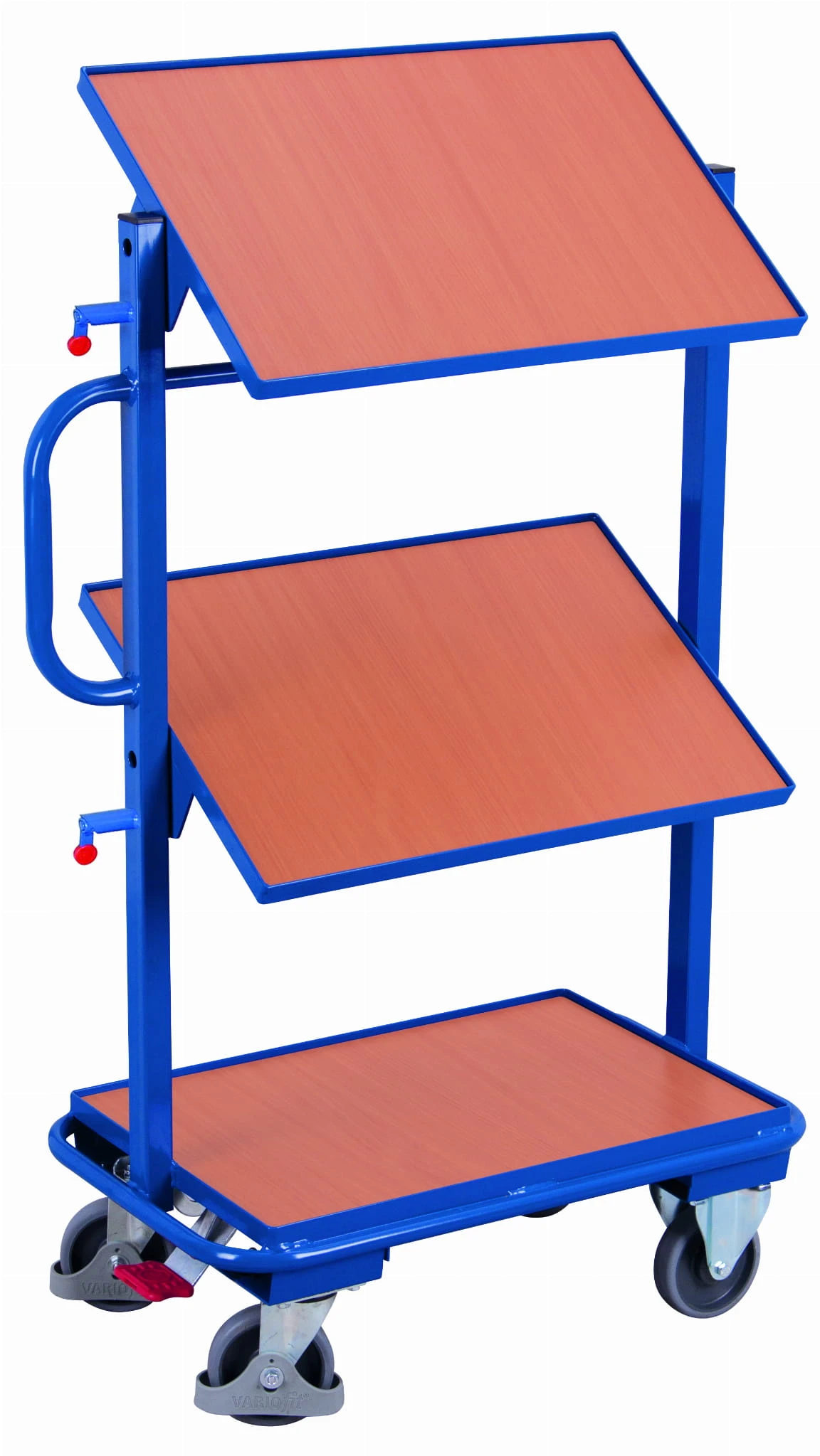 Wózek na skrzynki z 3 półkami, półki nachylane sw-400.803 — VARIOfit